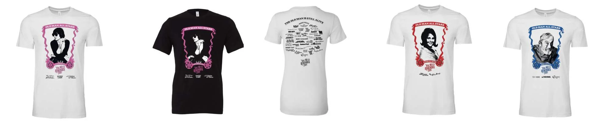 Each shirt features an Old Man All Star on the front and a collection of movie titles featured in The Old Man is Still Alive on the back.. As our first place finisher, Liza Minnelli gets two shirts: one in white and one in black. We're also offering new shirts featuring Elizabeth Taylor and John Huston, as the first and second runners-up, respectively. All of our limited edition Old Man All Stars shirts are available in a classic unisex fit and a women's slim fit, so be sure to select the style that suits you best!